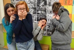 Slaan onze eerstejaars in paniek voor de naderende examens? Helemaal niet! Het was in de lessen Nederlands immers weer expressietijd!! In deze les werd gewerkt rond mimiek en lichaamstaal. De leerlingen mochten zich eens erg boos maken, superblij voelen, bang zijn, verwonderd zijn, ... Pff, wat hadden we het warm of brr, plots werd het koud of kregen we overal jeuk. Ook het uitbeelden van personages kwam aan bod. Herken jij de gitaristen, drummers, violisten, oude dametjes en heertjes, fotografen, ...? We kijken alvast uit naar het vervolg. Dan ligt de nadruk op stemexpressie.