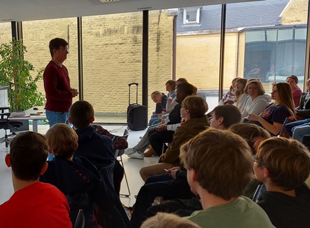 Op maandag 28 november bezochten onze eerstejaars de bibliotheek van Veurne voor een lezing van Luc Descamps. De leerlingen konden genieten van een interessante en luchtige uiteenzetting van de 60-jarige jeugdboekenschrijver. Descamps vertelde o.a. over zijn boekenreeksen “De donkere getallen” en “En ik dan?”. De Vlaamse schrijver kon heel wat leerlingen overtuigen hoe zinvol (en leuk!) het lezen van boeken kan zijn. Een aantal van hen gingen zelfs met een handtekening naar huis!