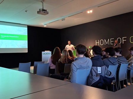 Na de lessen in het Junior College in Gent zette de bus onze zesdes af bij twee Veurnse topbedrijven: DUCO Ventilation & Sun Control en Trotec NV (producent van voederingrediënten). Beide bedrijven zijn absolute specialisten in hun sector en zetten bovendien volop in op duurzaamheid, wat anno 2026 een heel grote troef is.