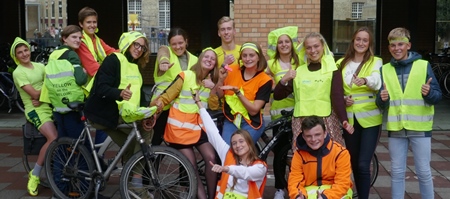 De donkere maanden komen er nu snel aan en dus is het tijd om weer te wijzen op het belang van zichtbaarheid van de zwakke weggebruikers. De sportraad toonde vanmiddag alleszins het goede voorbeeld door helemaal in fluo getooid te poseren. Dit als startschot van de tweede jaargang van de actie 'Yellow on the velo(w)', die vorig schooljaar alle leerlingen een rugzakhoes bezorgde. We hopen opnieuw heel veel van die rugzakhoezen en andere fluo-attributen in het verkeer te zien verschijnen!